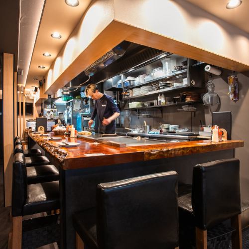 鉄板の熱と香ばしい匂いを感じながら、じっくり料理を堪能できる特等席。お一人様でも気軽に楽しめます。